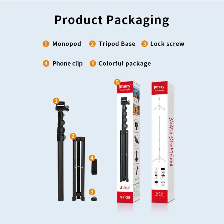 بدنهی مقاوم Jmary MT-39 از آلیاژ فلزی ساخته شده و قابلیت نصب انواع دوربینهای DSLR، کامپکت و حتی موبایل (با هولدر) را دارد.